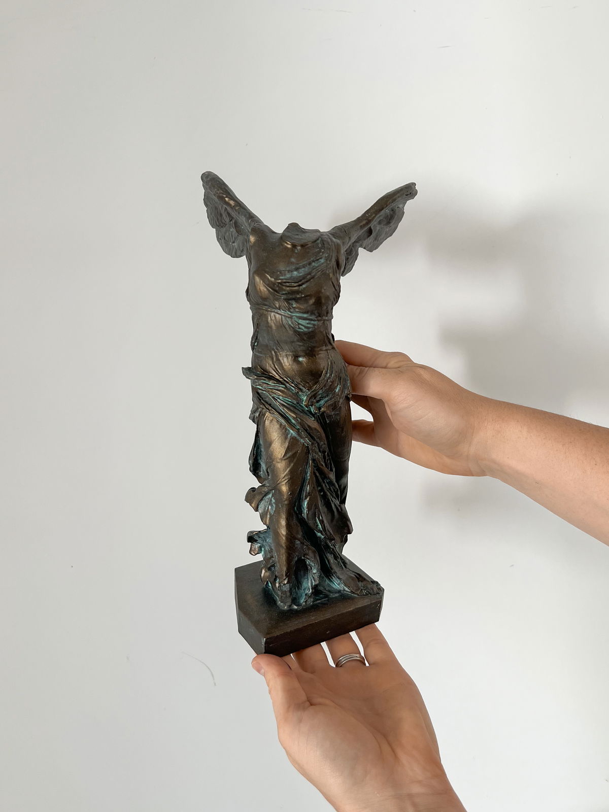Por favor, en la última foto se ve la parte de atrás de la escultura. No es defecto, es así la escutura original. Los hierros en una de las alas son parte de la restauracion de la estatua. No aceptamos reclamos por este motivo.