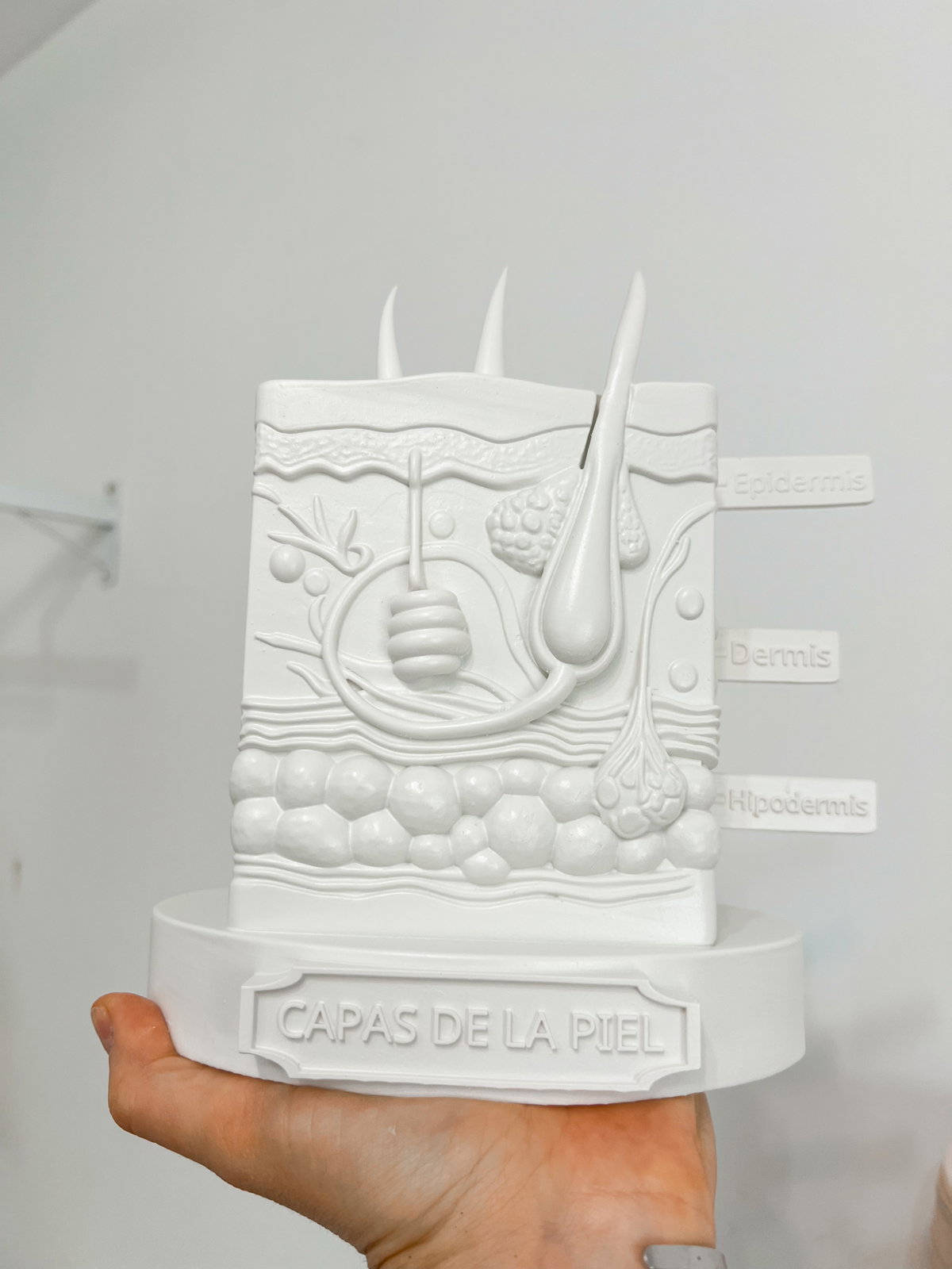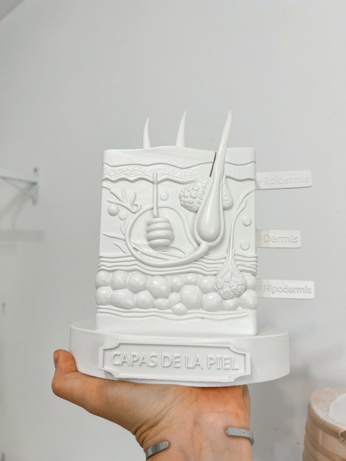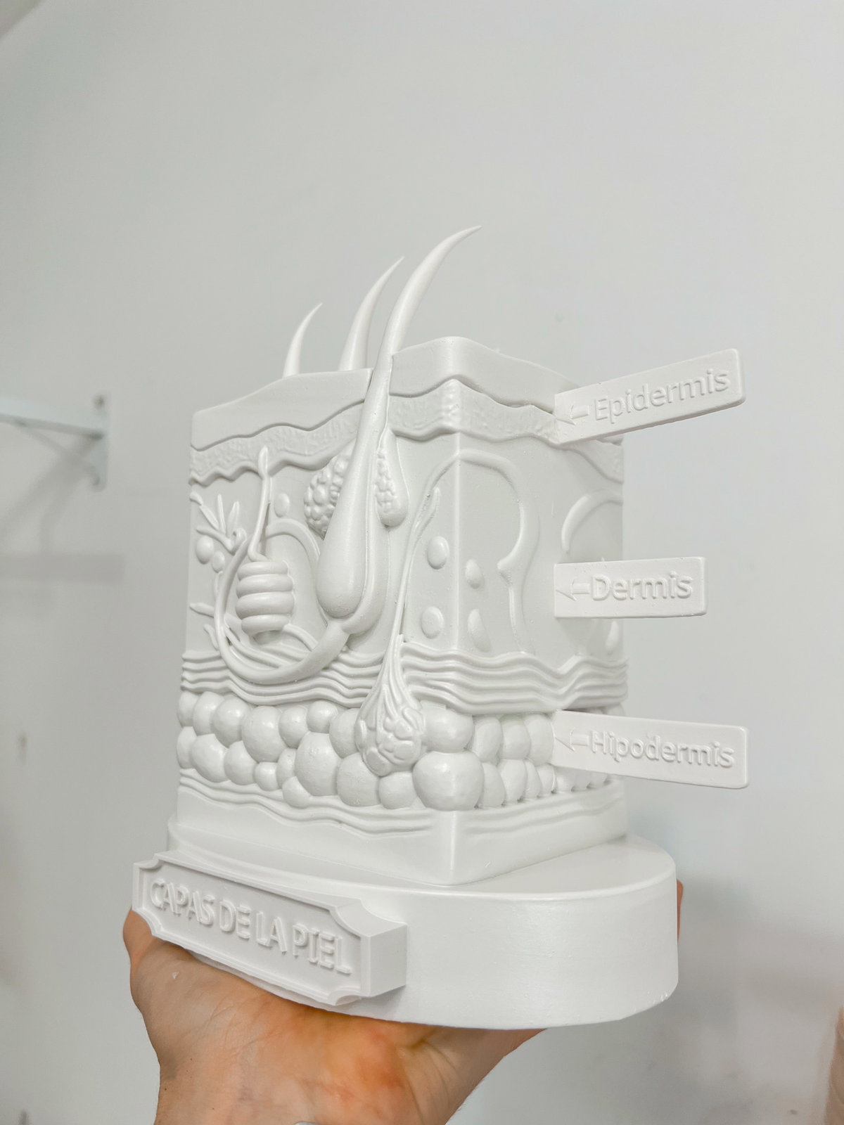 Cada pieza se imprime en 3D con resina UV, logrando una definición impecable en los detalles. Luego, la rellenamos para darle peso y estabilidad. Finalmente, la pintamos con aerosol para obtener un acabado mate que recuerda al concreto, como en nuestra colección general.
