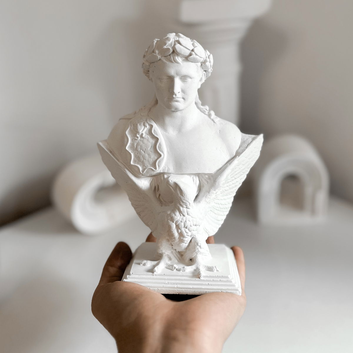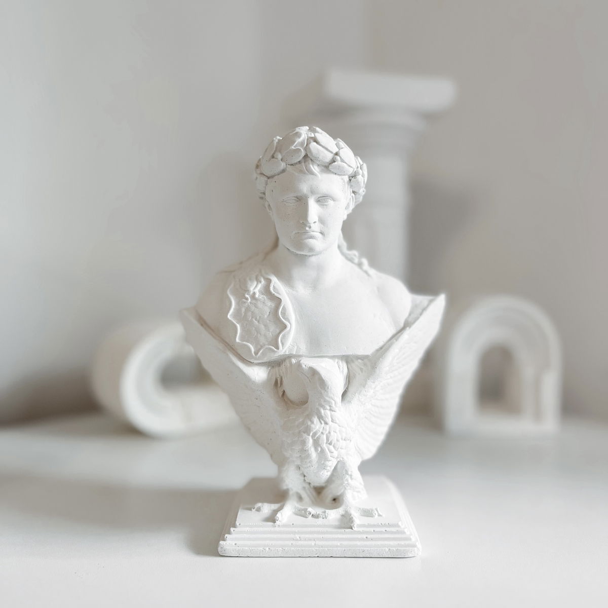 Una pieza escultórica inspirada en la figura histórica de Napoleón Bonaparte, perfecta para añadir un toque de carácter y presencia histórica a estantes, escritorios o bibliotecas.
