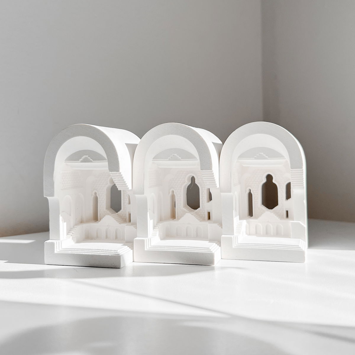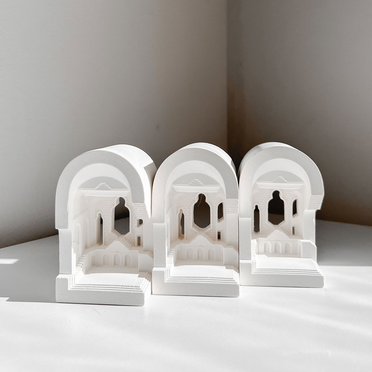 Una pieza inspirada en la sobria elegancia de la arquitectura persa, perfecta para aportar un detalle con carácter y textura a estantes, mesas auxiliares o rincones especiales.