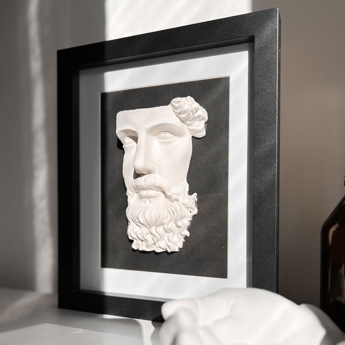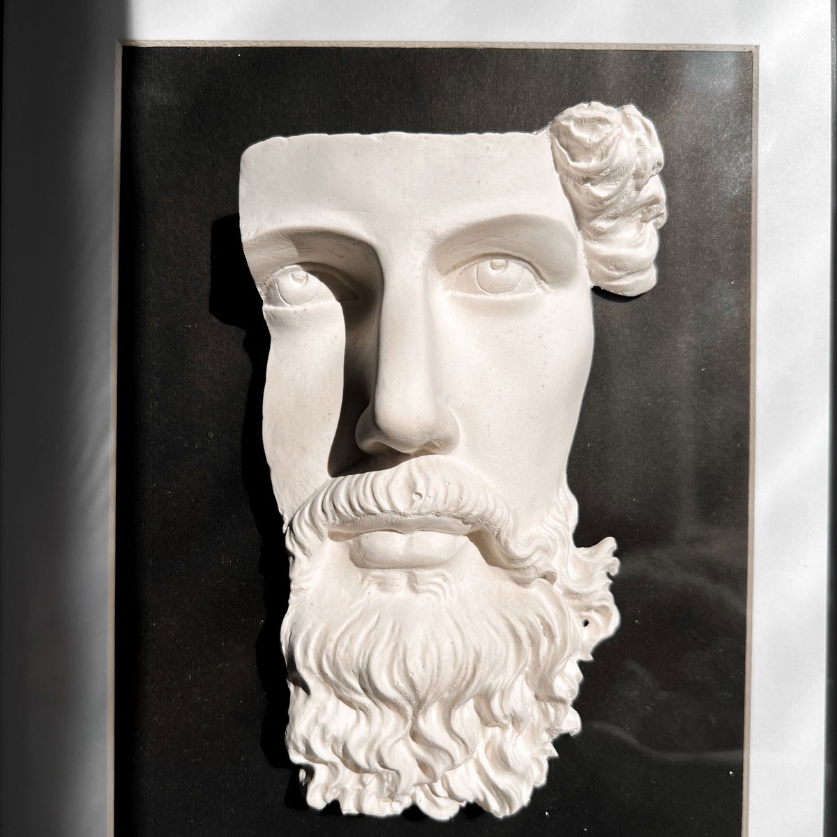 El montaje sobre vidrio permite resaltar el relieve y la textura de la figura.