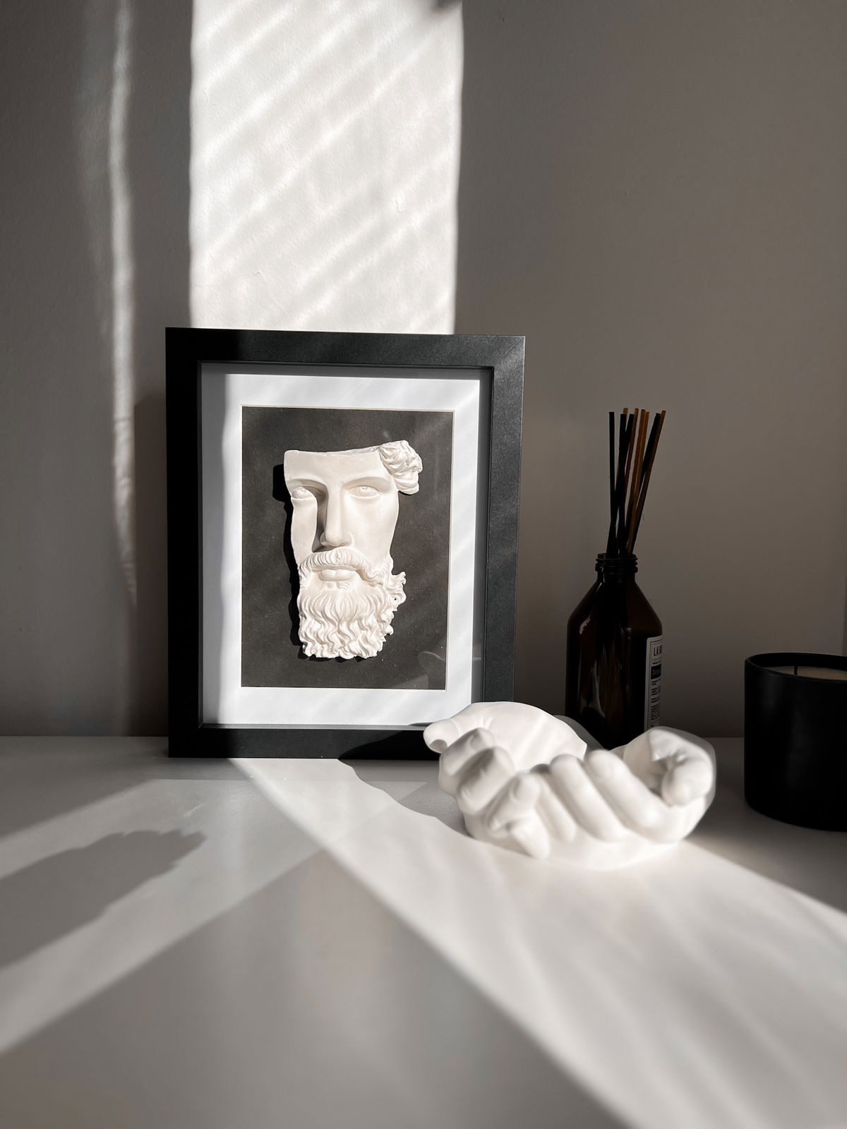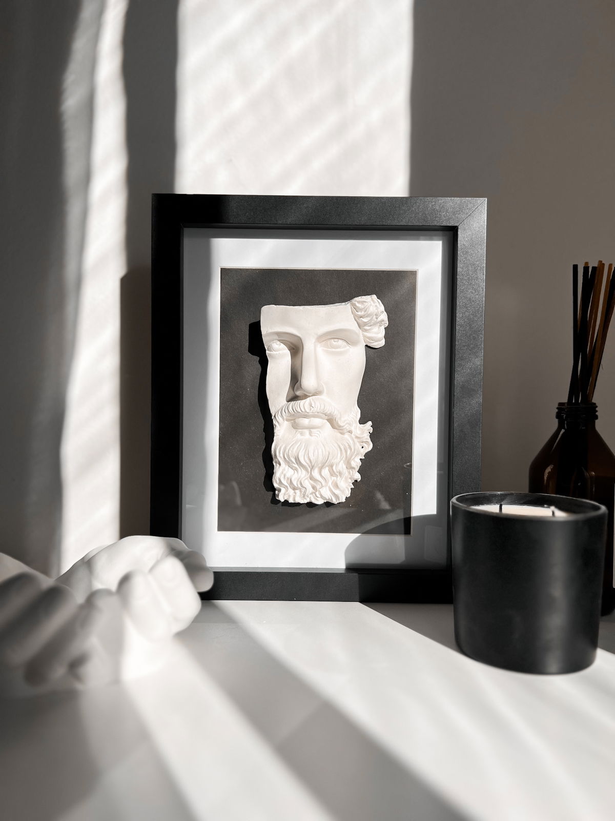 Material: figura de cemento, marco de madera, vidrio