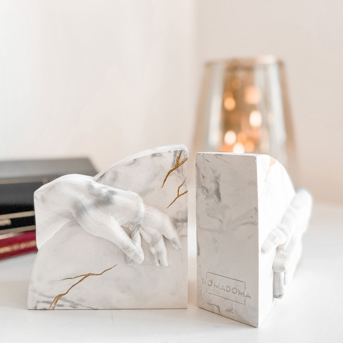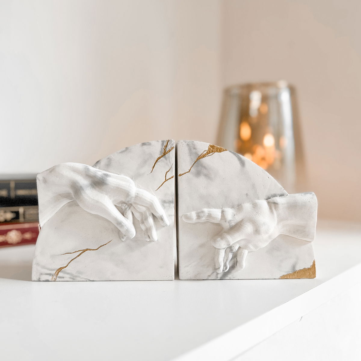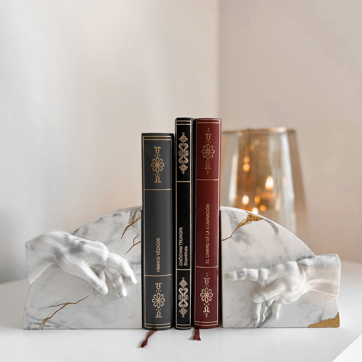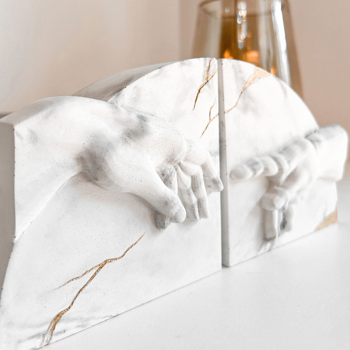 Dos manos enfrentadas evocan el gesto suspendido del encuentro, reinterpretado en una pieza escultórica de equilibrio y tensión.