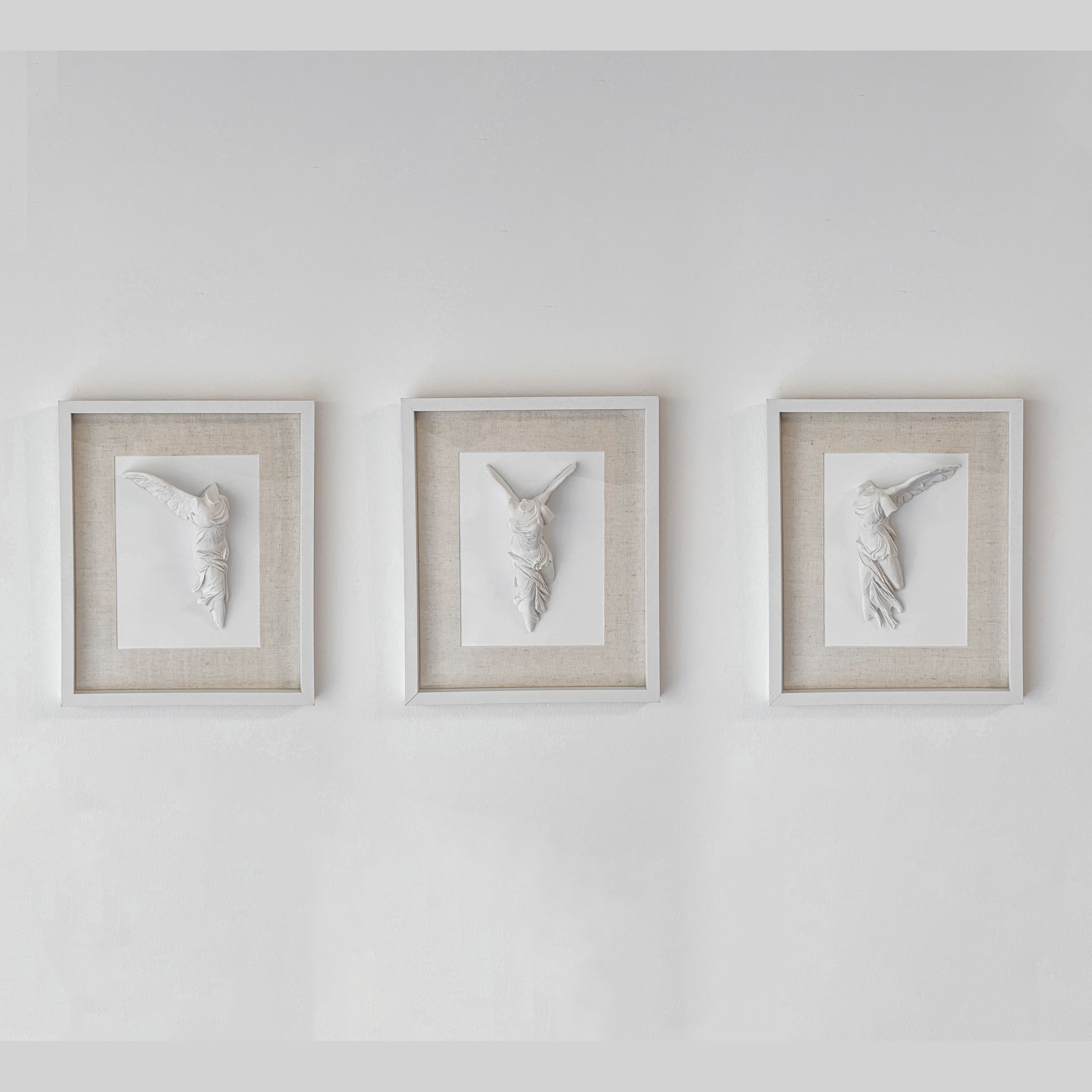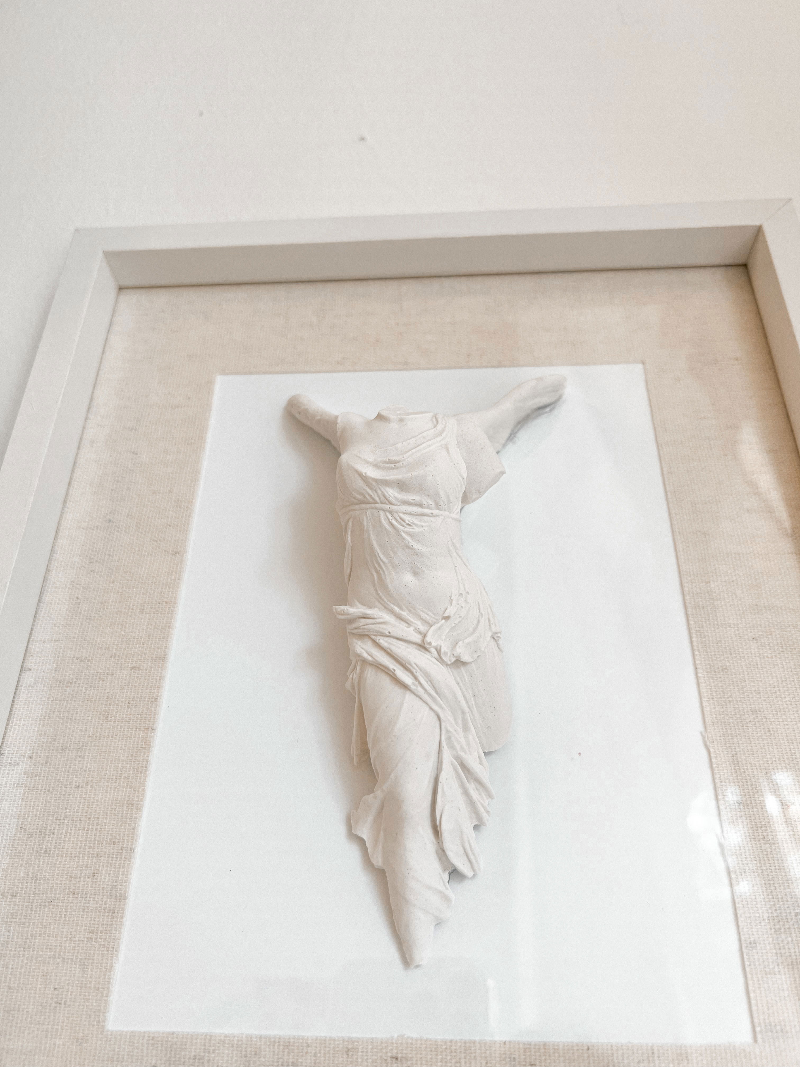 - Material: Las figuras están hechas en resina ecológica. El cuadro es de madera laminada con un recuadro de paspartú color "lino crudo". El paspartú tiene textura de tela y los marcos tienen una textura de madera muy suave.