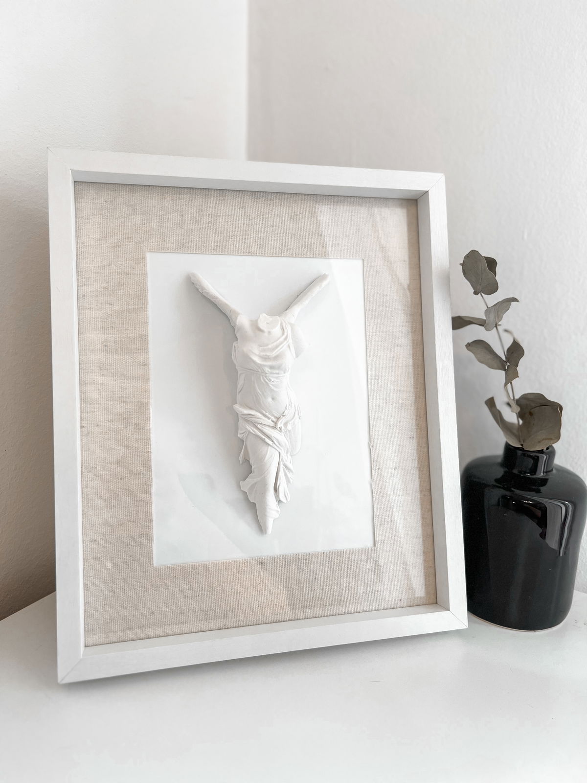 Tamaño aproximado: figura 19 cm de alto; cuadro 24 × 29 cm