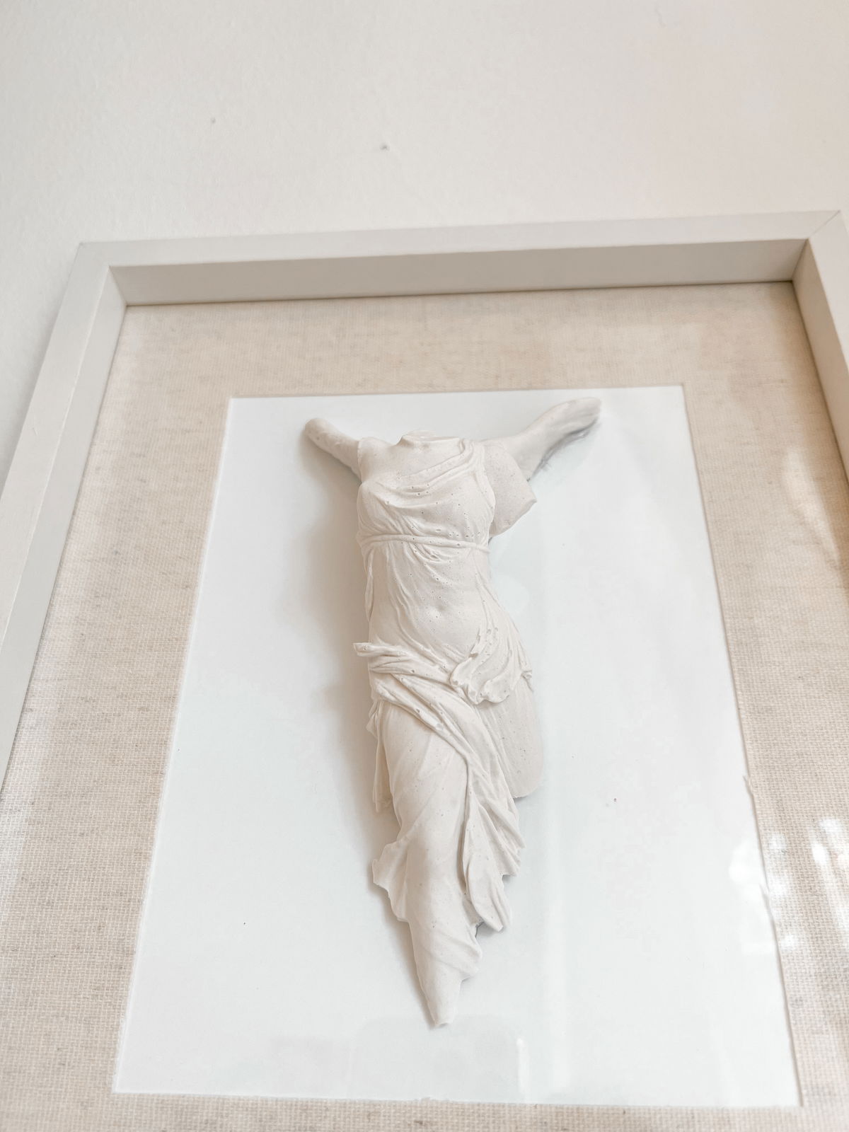 El marco de madera y el paspartú aportan estructura y contraste con la figura montada sobre vidrio.