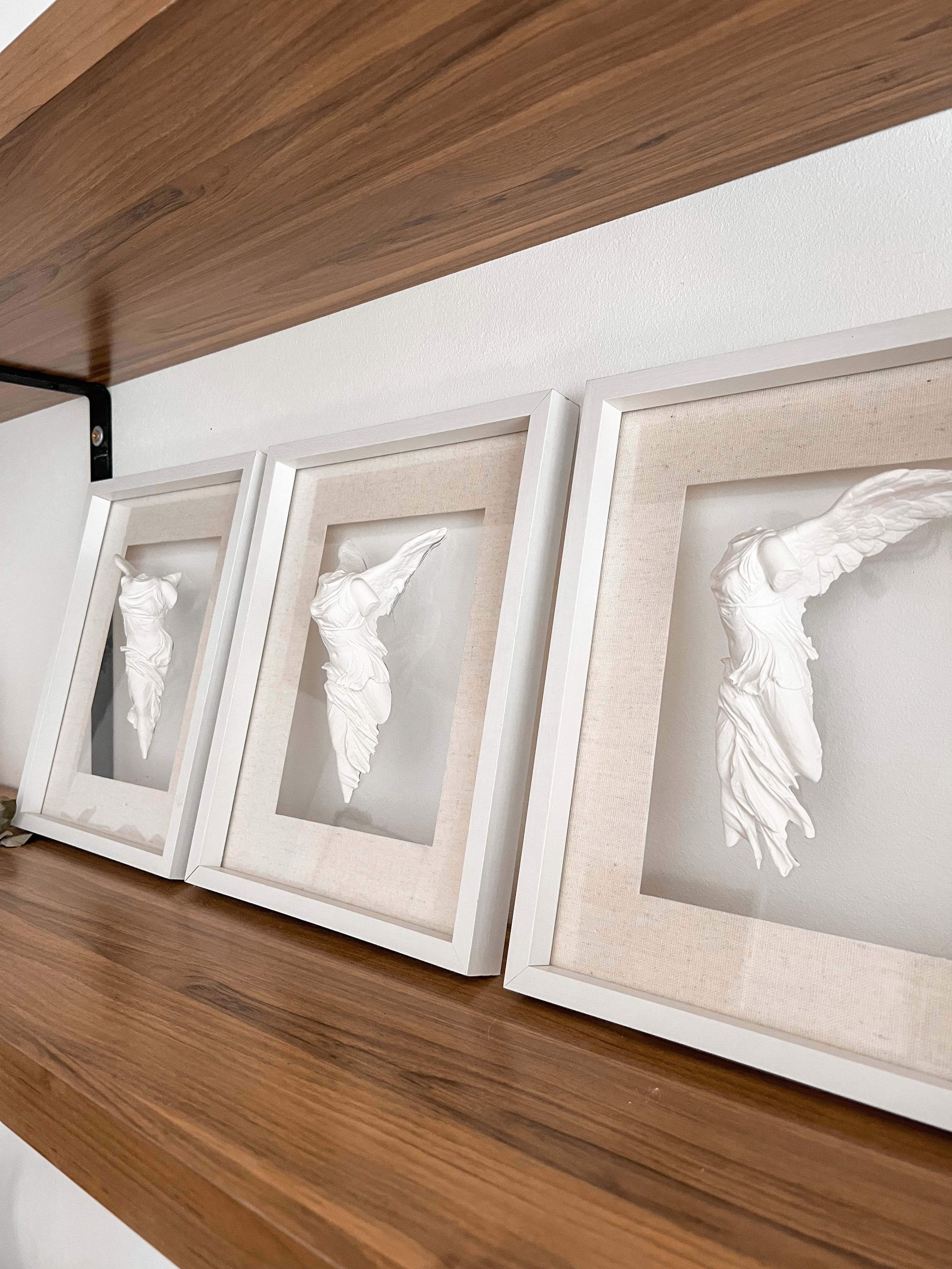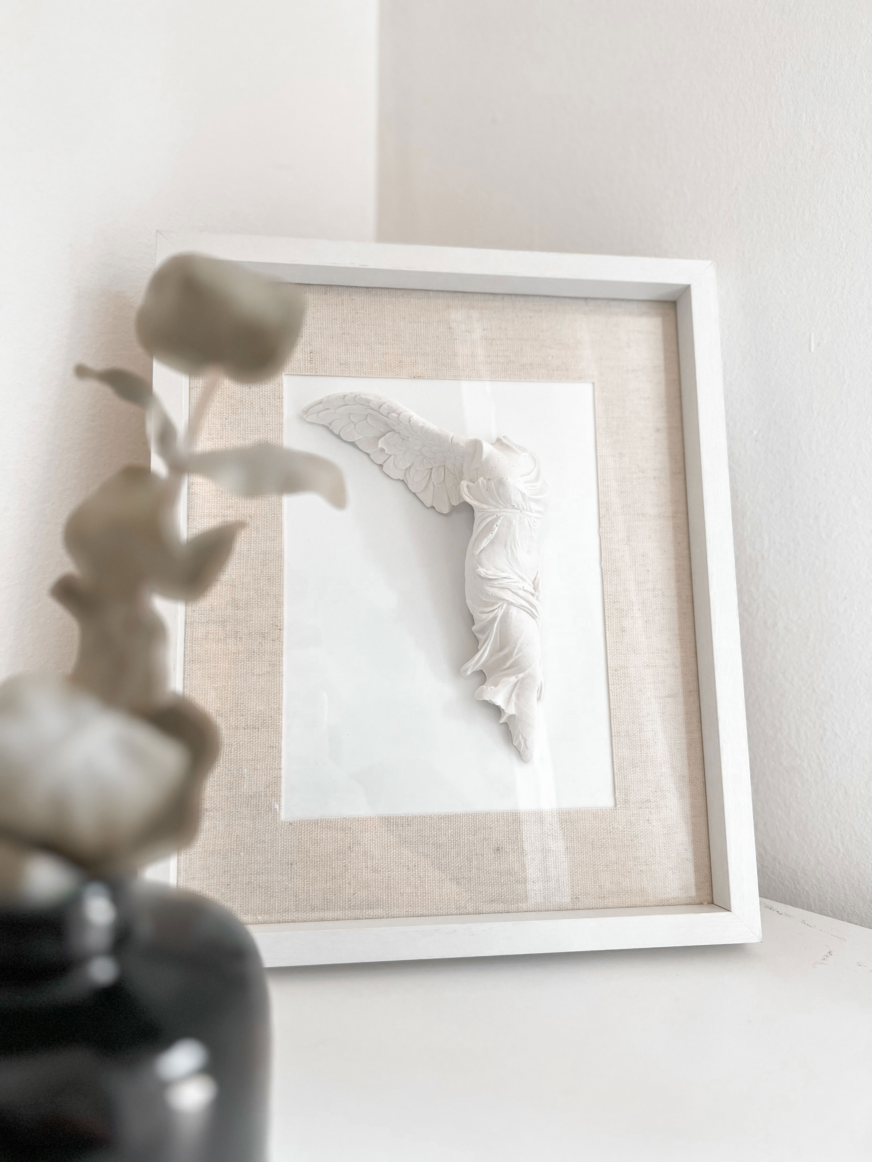 - Material: La figura está hecha en resina. El cuadro es de madera laminada con un recuadro de paspartú color "lino crudo". El paspartú tiene textura de tela y los marcos tienen una textura de madera muy suave.