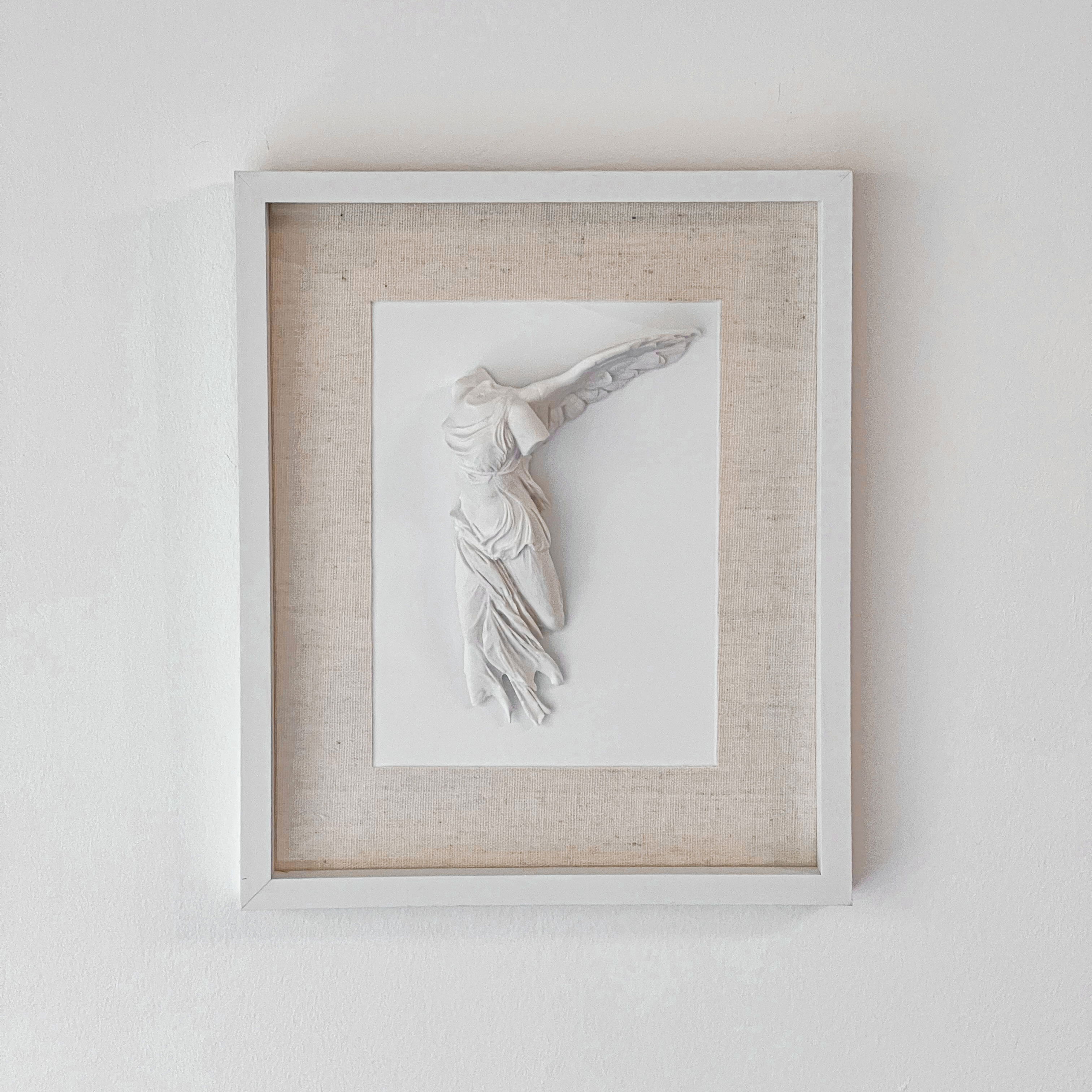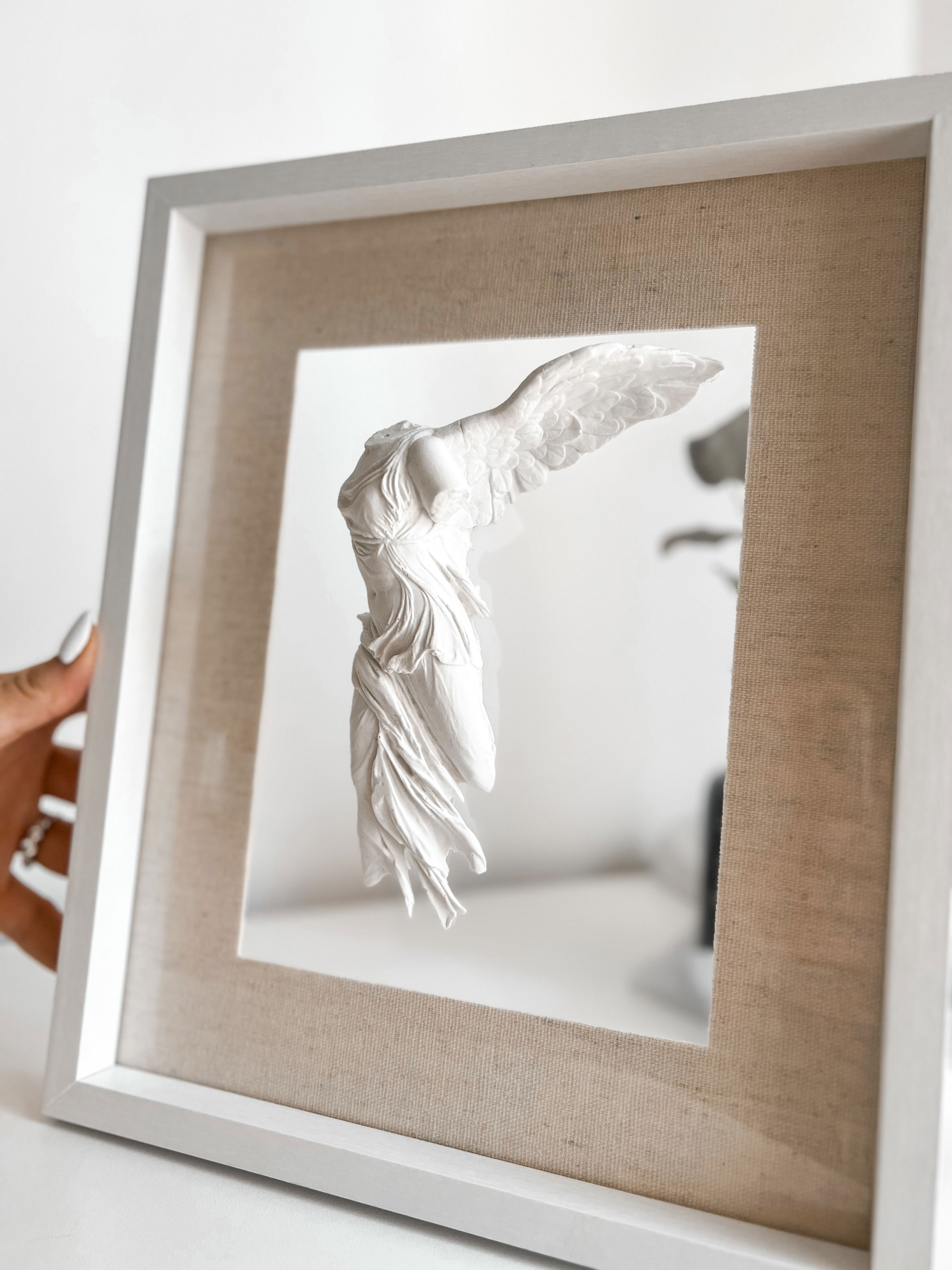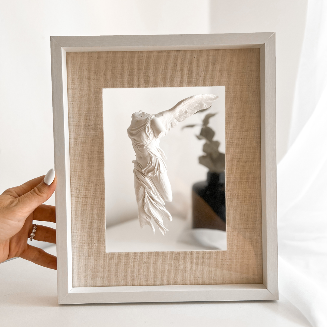 - Material: La figura está hecha en resina. El cuadro es de madera laminada con un recuadro de paspartú color "lino crudo". El paspartú tiene textura de tela y los marcos tienen una textura de madera muy suave.