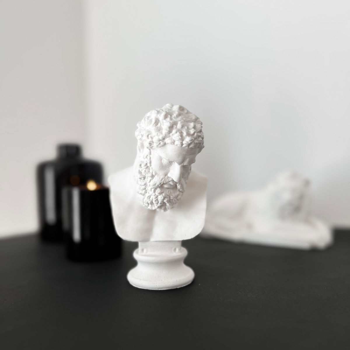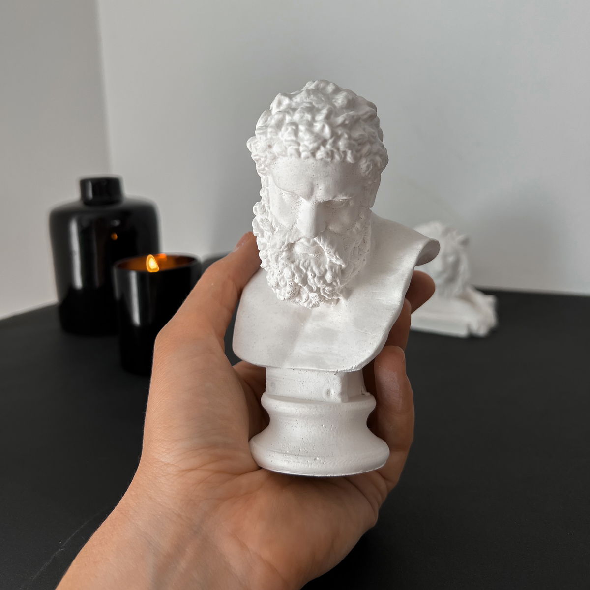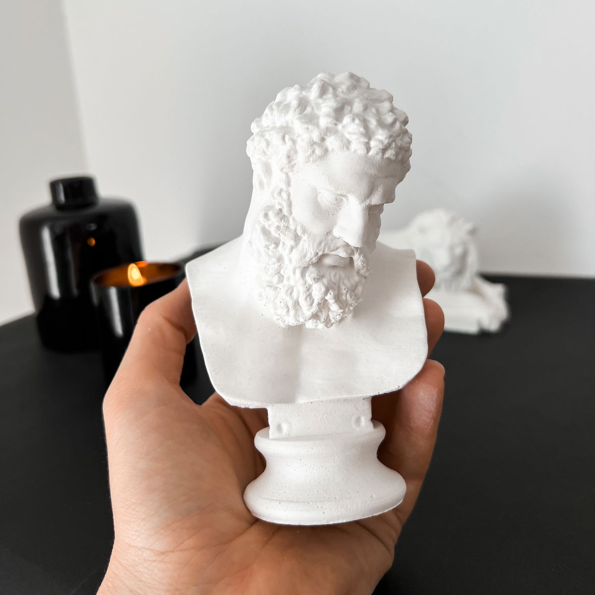 Un pequeño busto inspirado en la famosa estatua de Hércules Farnesio, ideal para decorar con elegancia y fuerza un rincón, estantería o escritorio.