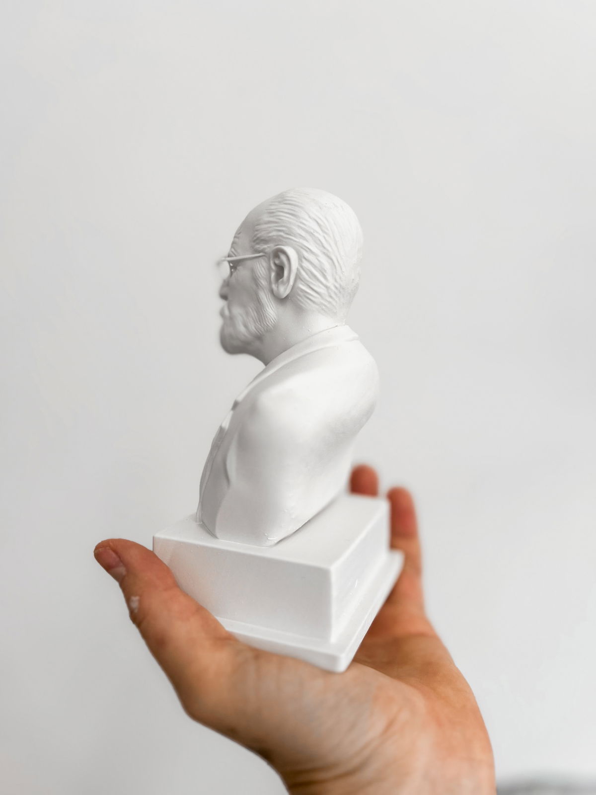 Cada pieza se imprime en 3D con resina UV, logrando una definición impecable en los detalles. Luego, la rellenamos para darle peso y estabilidad. Finalmente, la pintamos con aerosol para obtener un acabado mate que recuerda al concreto, como en nuestra colección general.