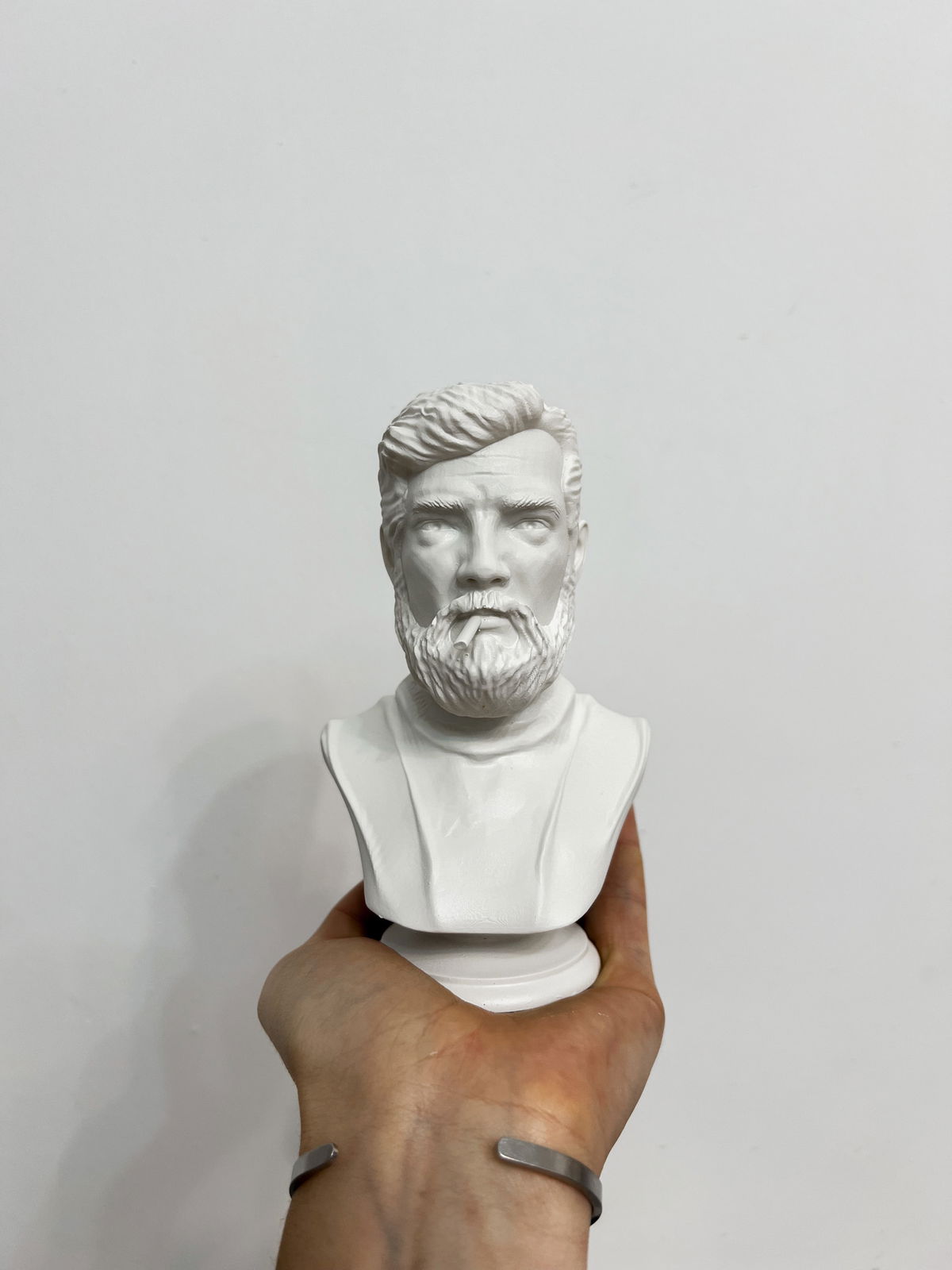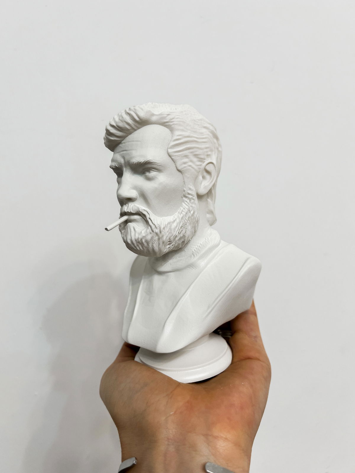 Cada pieza se imprime en 3D con resina UV, logrando una definición impecable en los detalles. Luego, la rellenamos para darle peso y estabilidad. Finalmente, la pintamos con aerosol para obtener un acabado mate que recuerda al concreto, como en nuestra colección general.