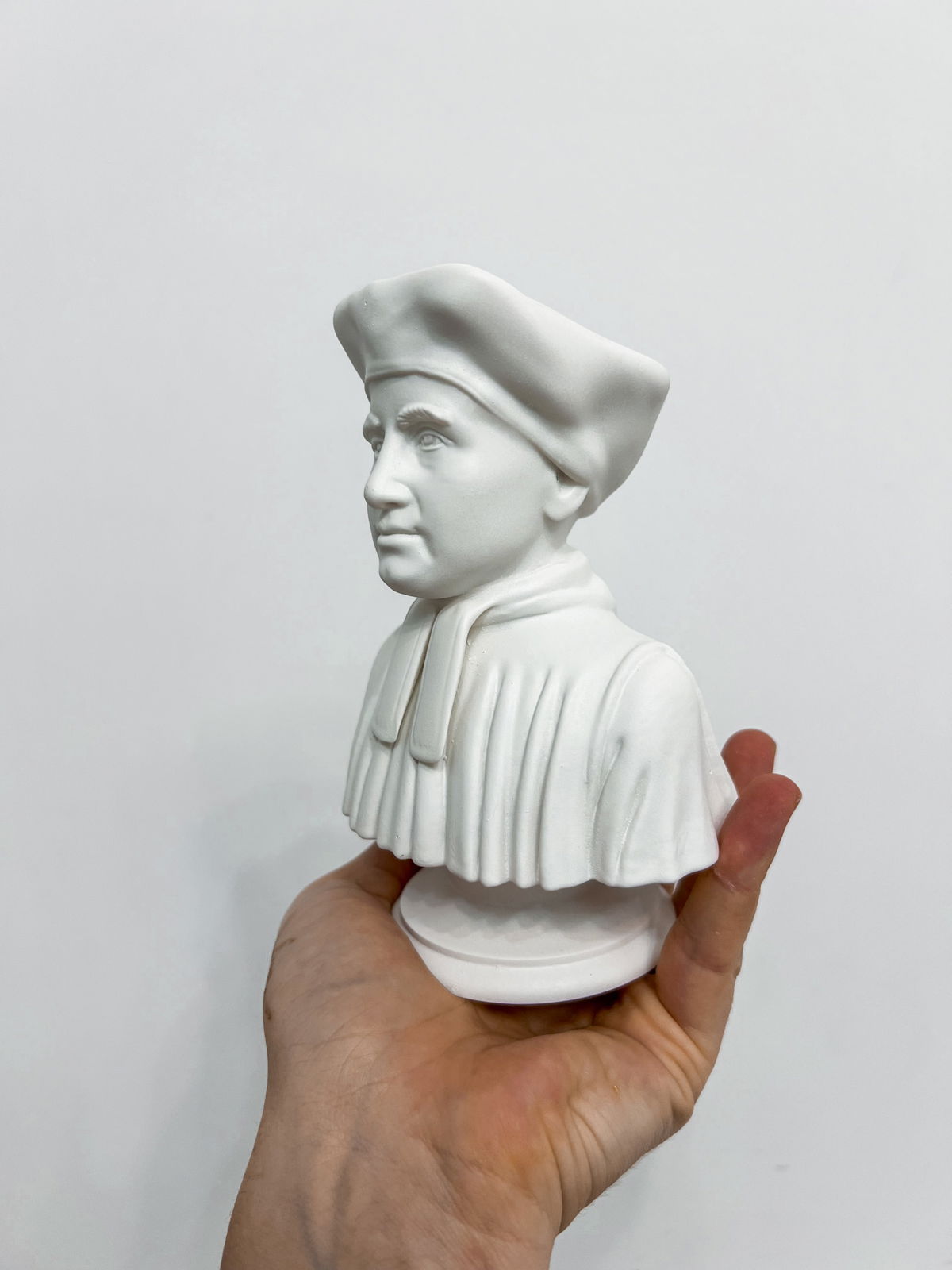 Cada pieza se imprime en 3D con resina UV, logrando una definición impecable en los detalles. Luego, la rellenamos para darle peso y estabilidad. Finalmente, la pintamos con aerosol para obtener un acabado mate que recuerda al concreto, como en nuestra colección general.