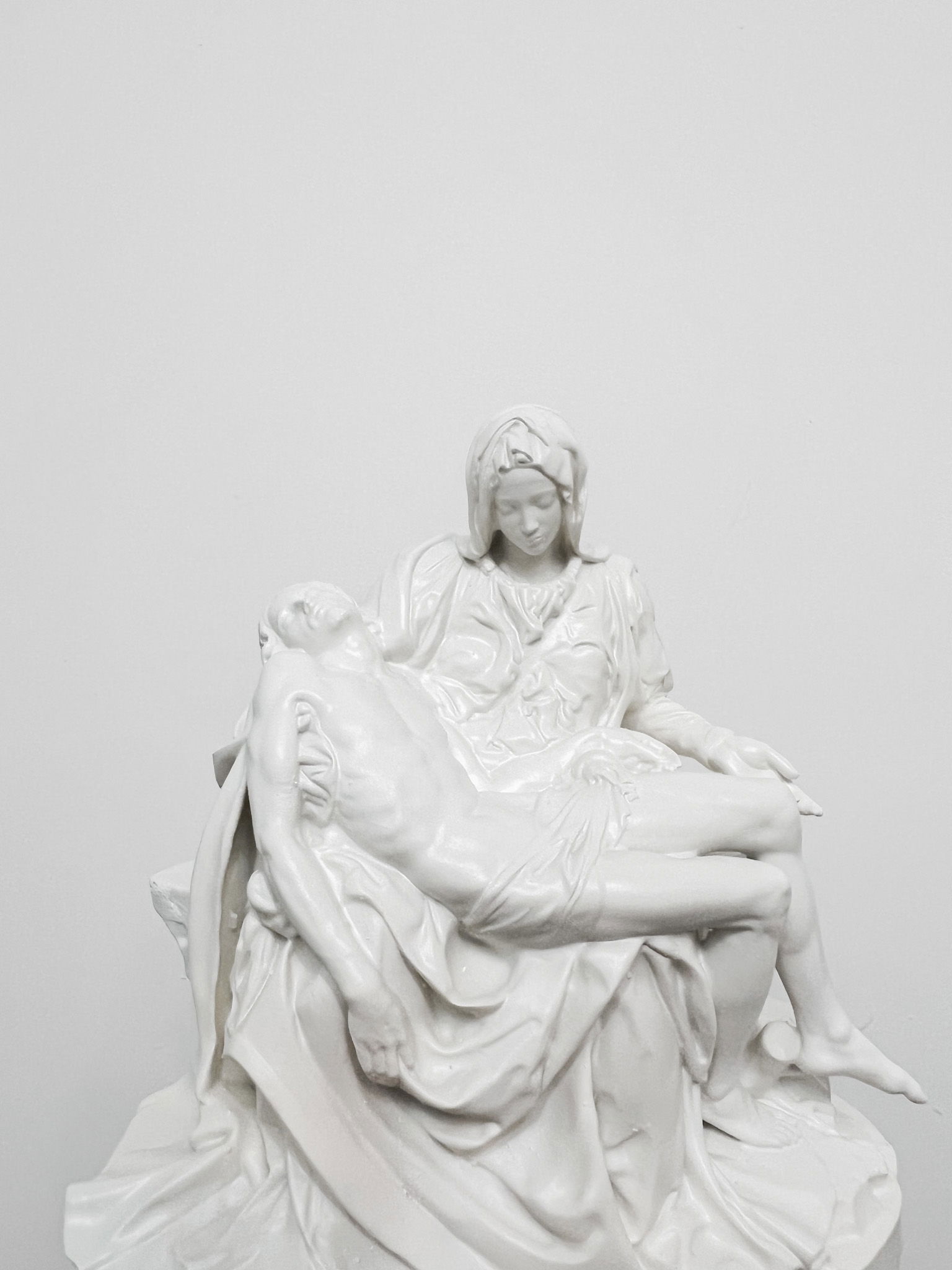 La diferencia de La Piedad en cemento es la posición de la mano de la Virgen María. En la figura de cemento está debajo de la pierna de Jesús y en la version esta de resina la mano está estirada como es en la escultura original.