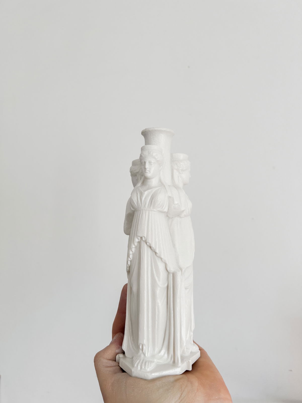 Cada pieza se imprime en 3D con resina UV, logrando una definición impecable en los detalles. Luego, la rellenamos para darle peso y estabilidad. Finalmente, la pintamos con aerosol para obtener un acabado mate que recuerda al concreto, como en nuestra colección general.