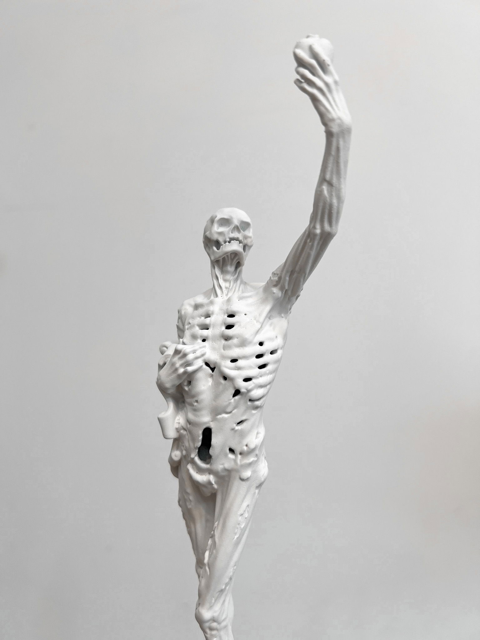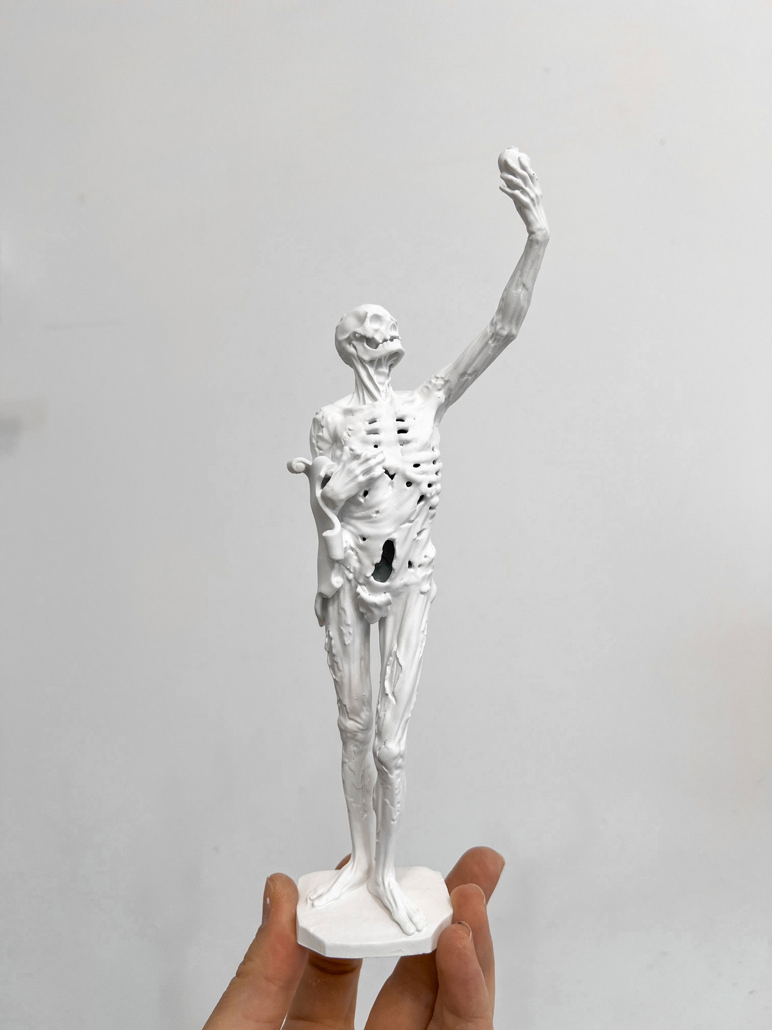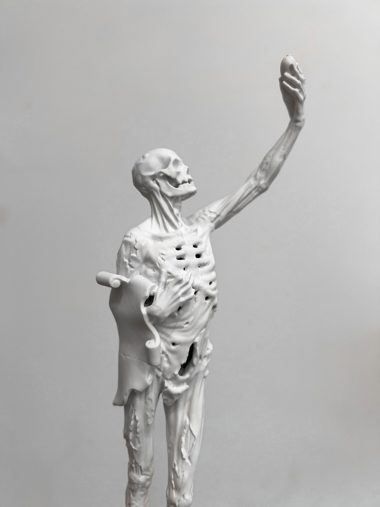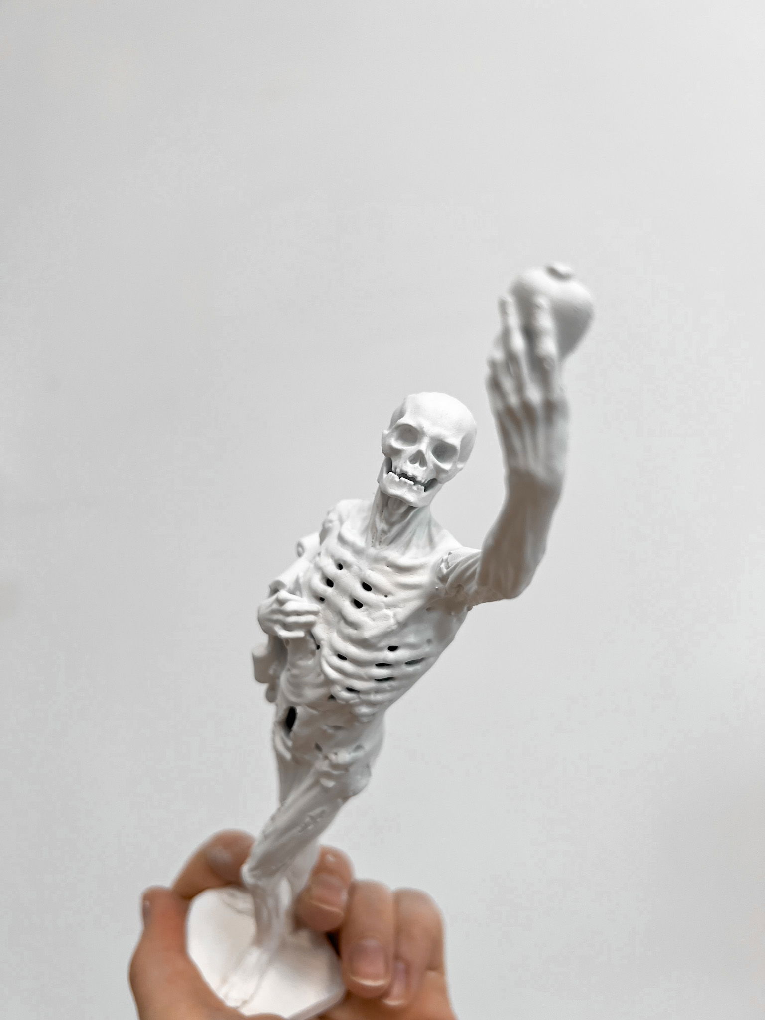 Cada pieza se imprime en 3D con resina UV, logrando una definición impecable en los detalles. Luego, la rellenamos para darle peso y estabilidad. Finalmente, la pintamos con aerosol para obtener un acabado mate que recuerda al concreto, como en nuestra colección general.